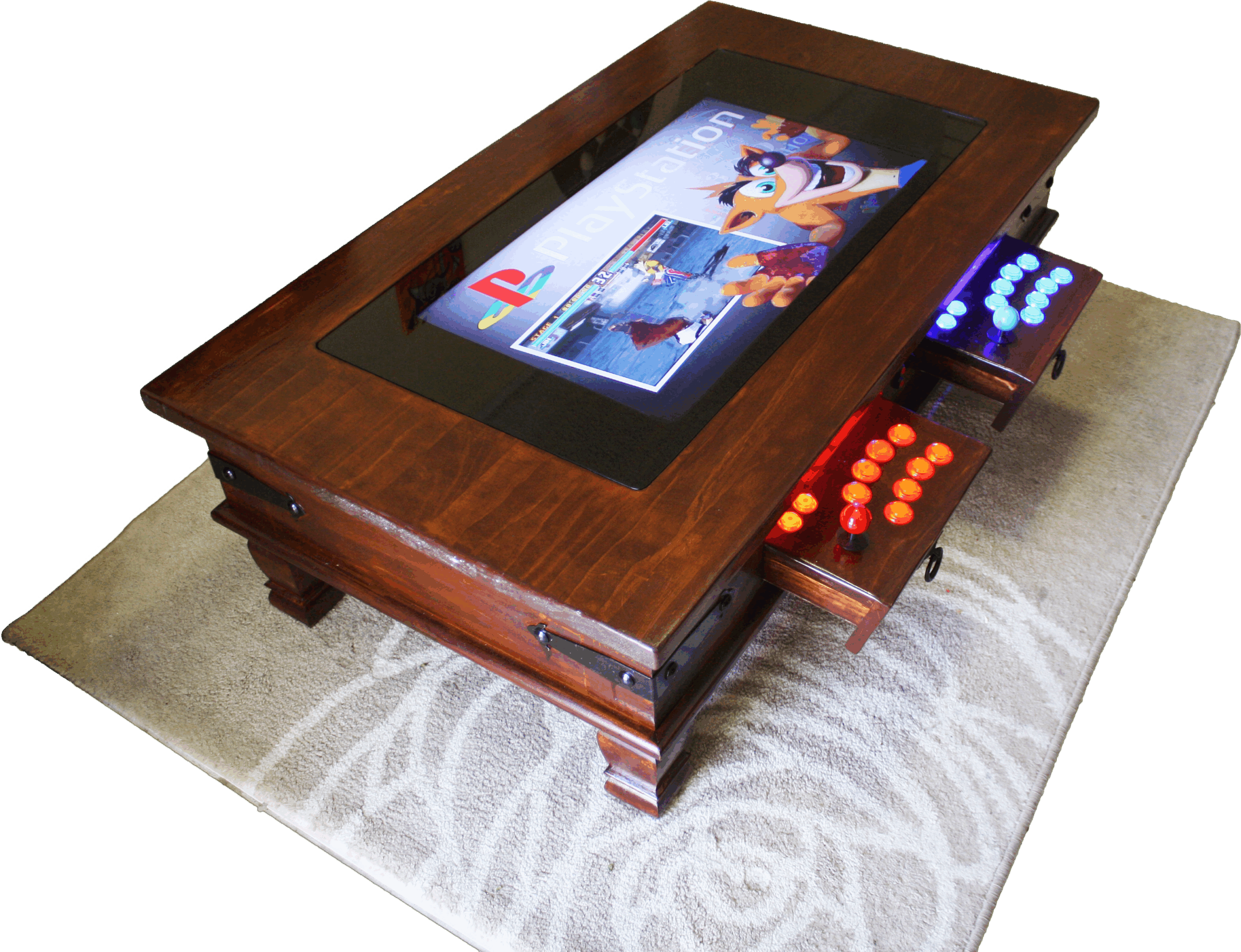 - Controllers: 2x Custom “Hidden Drawer” 8-button Arcade Controllers | 2x PS3 Controllers (connect via USB)